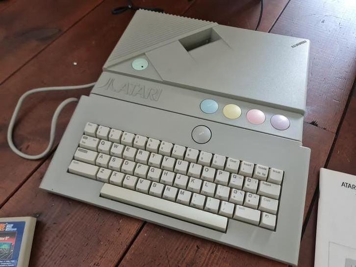 Dit is een atari xe game system. Het systeem heeft een ingebouwd toetsenbord en een cartridge slot. Er zit ook een power knop op. Geen joystick. Wel pistool, 2 games en handleidingen. 1 Game start op,