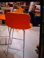 7 oranje kunstof barkrukken met metalen onderstel. Zithoogte ongeveer 70 cm. €12,50 per stuk. In 1 koop € 75,- in goede