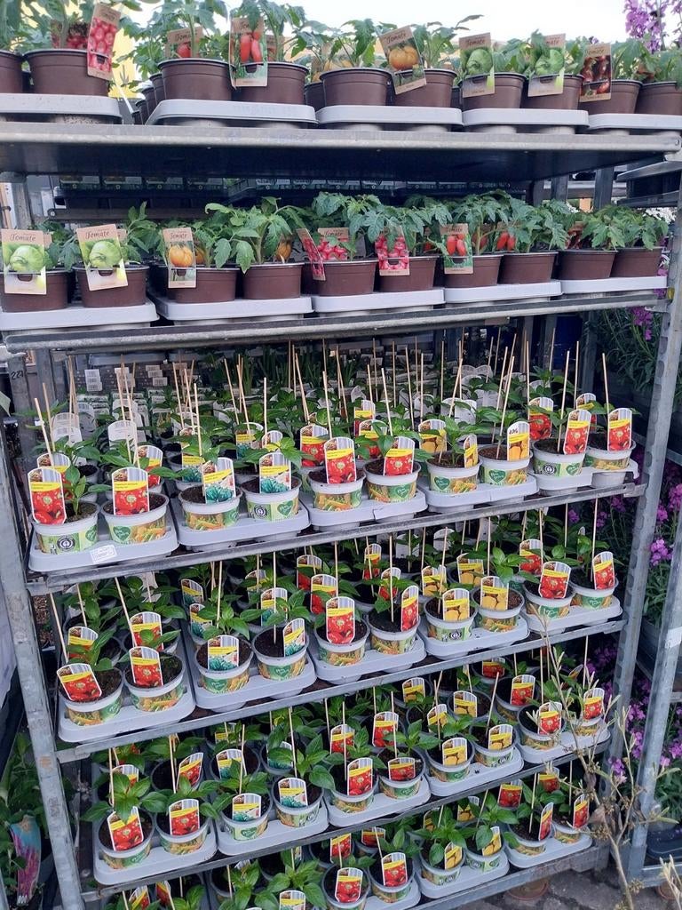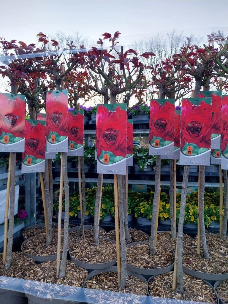 Diverse soorten klimplanten te koop. Er zijn verschillende soorten en kleuren beschikbaar, zoals te zien op de foto's. De planten staan in potten en zijn al wat gegroeid, met bamboestokken als ond