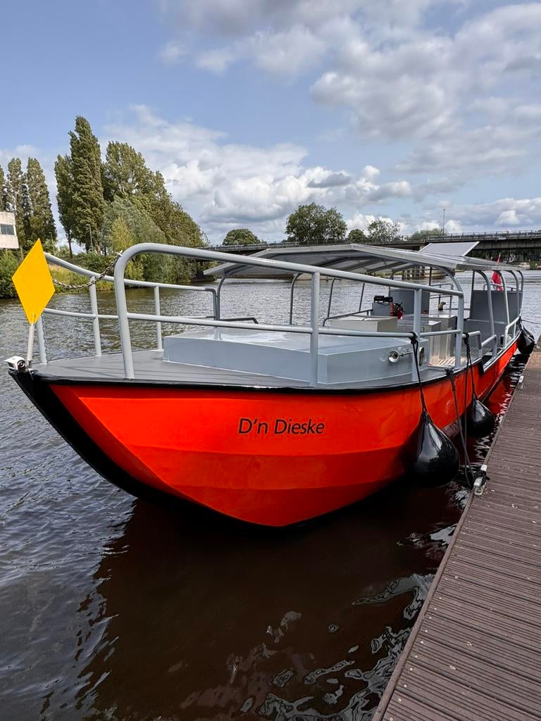Cvo gekeurd keuring voor 40 personen. De boot is volledig gelakt onderwater schip volledig behandeld. Kan er weer jaren tegen aan. 12. Meter lang, 3 meter breed, 0,40 diepgang, 2,10 doorvaart hoogte Zo goed als nieuw Ophalen