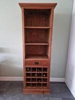 Mooie, onbehandelde teakhouten boekenkast die ook als wijnkast gebruikt kan worden. De kast heeft meerdere planken(3) en een lade. Onderin is ruimte voor het opbergen van 16 flessen. Een stijlvolle to