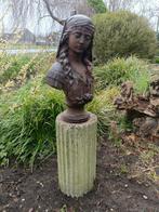 Prachtig gietijzeren buste van een jonge vrouw met hoofddoek. Dit is een echt oud gietijzeren beeld. Dus niet van de groothandel. Het beeld is 60 cm hoog en 37 cm breed. Ivm het gewicht alleen ophalen