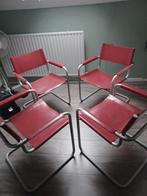 Mooie set van vier rode stoelen. De stoelen hebben een metalen frame en een zitting en rugleuning van leer. Ze zijn in gebruikte,