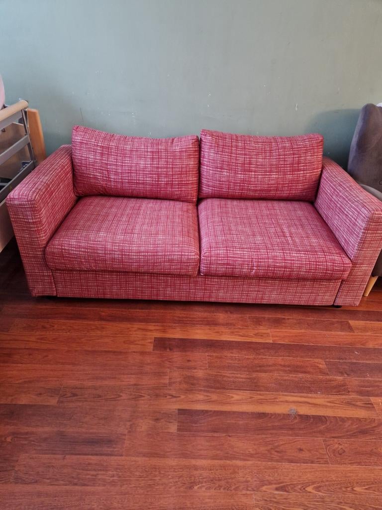 Ikea vimle slaapbank met bijpassende hocker in dezelfde kleur. Kleur rood wit geruit. Losse zit en rugkussens. Hoezen kunnen eraf en gewassen worden. ( Je kunt zelfs nog nieuwe hoezen bij ikea kopen.)Gebruikt Ophalen Tweepersoons