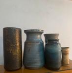 Handgemaakt aardewerk met kenmerkende glazuren in blauwe, bruine en beige tinten. Vijf mooie vazen/ potten, doe een goed bod en ze zijn van jouw.