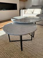 Prachtige set van twee salontafels met een elegant carrara marmeren blad en een stevige zwarte metalen poot. De set bestaat uit twee tafels met bladen van respectievelijk 100 cm en 80 cm, perfect om s