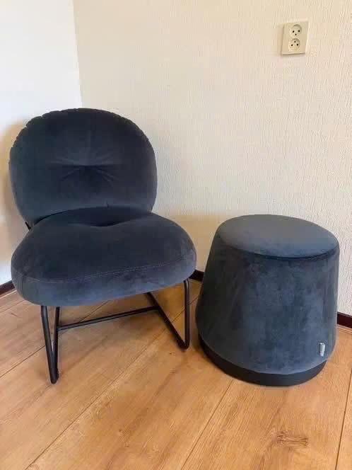 grijs/blauw fauteuil met poef / loungestoel met poef