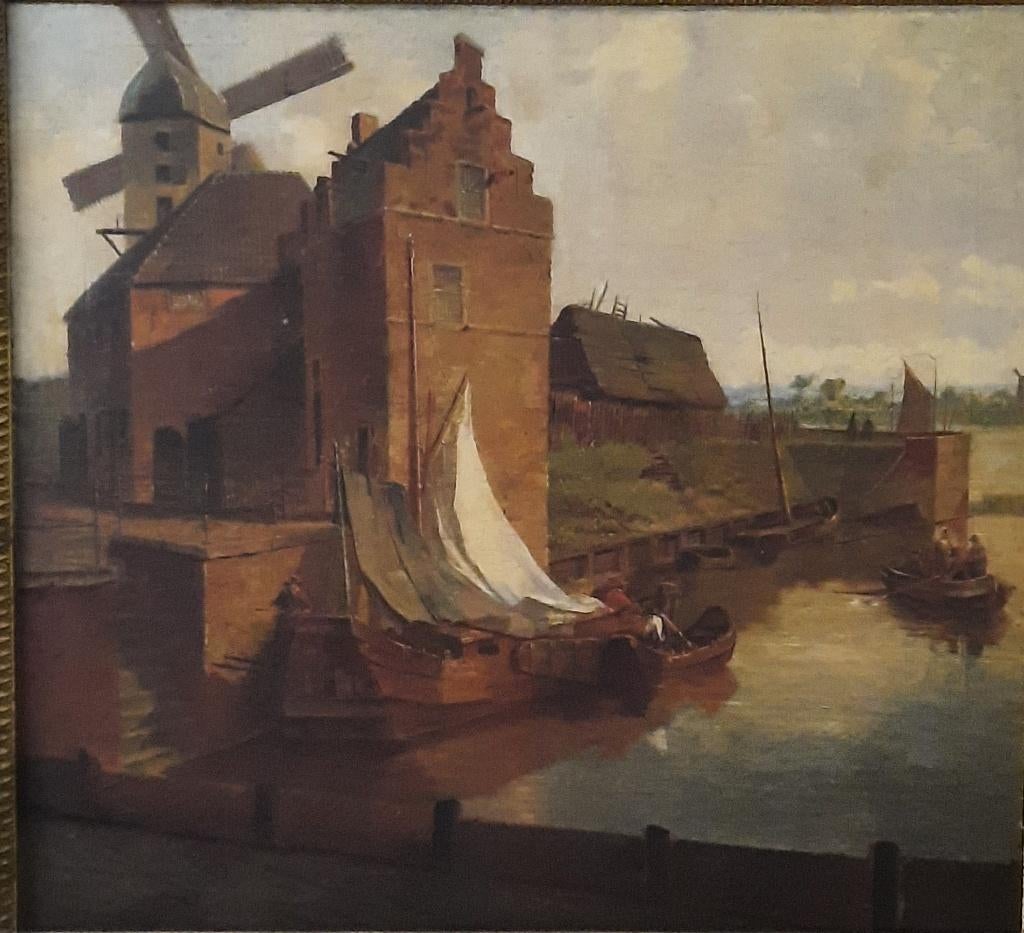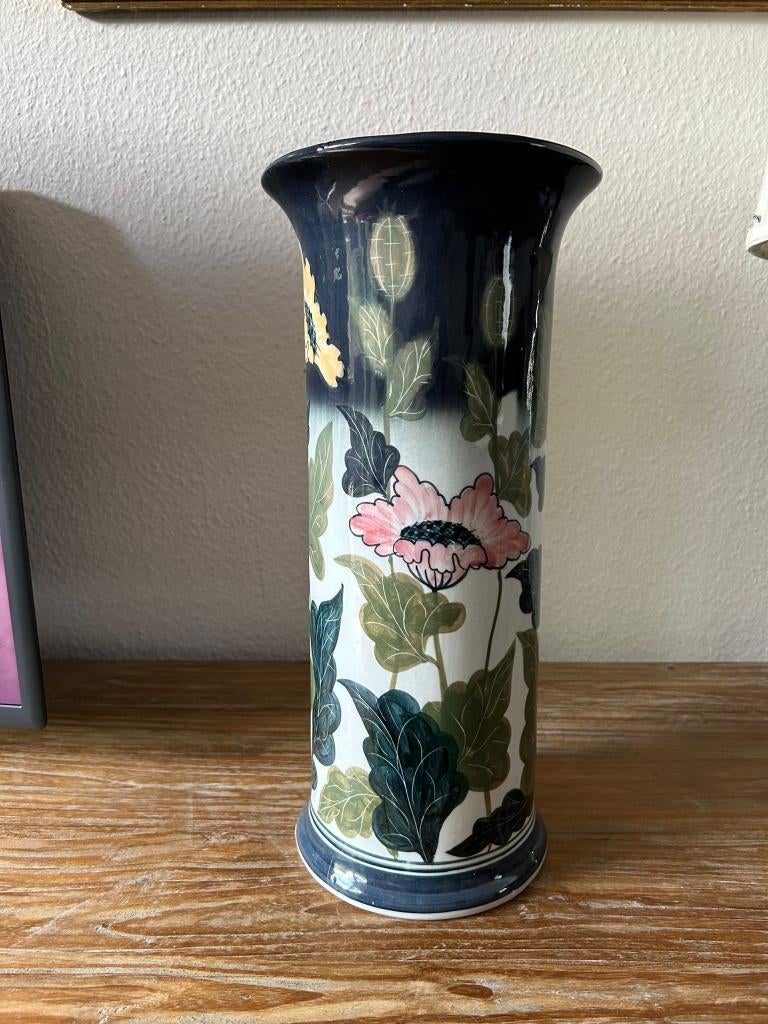 Cilindrische vaas, licht uitlopende hals, brede voet. Prachtige kleuren, handgeschilderd. Standring met natuurlijke slijtage. Groot formaat siervaas. Vermoedelijk omgeving zuid-duitsland. Hoogte: 41 c