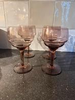 4 prachtige oude design wijnglazen. Ze zijn licht paars / aubergine van kleur. Hoogte: 15 cm. De glazen zijn puntgaaf!