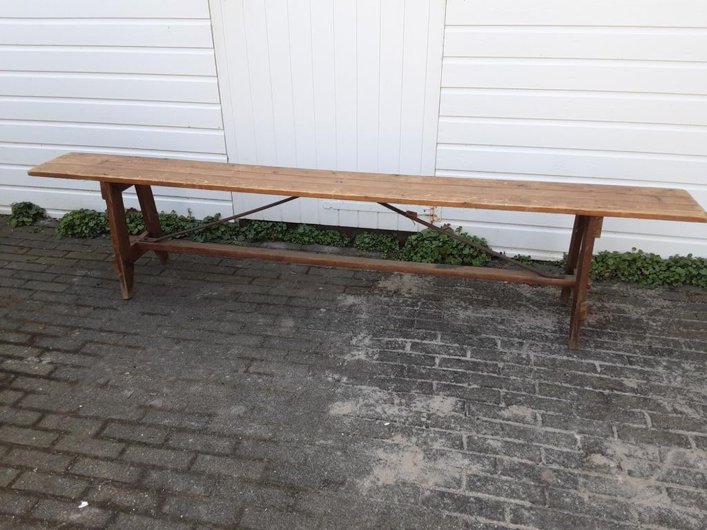 Mooie oude landelijke bank. Hout met ijzer, mooi verweerd. Lente ongeveer 227 cm, hoogte 48 cm en de diepte is 25 cm. Alleen ophalen. Prijs per stuk € 75,00 .