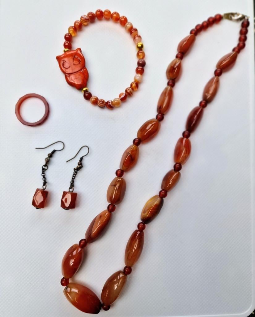 Deze set bestaat uit een fraaie ketting, armband (deze is agaat) , oorbellen en een ring. Meeste is gemaakt van edelsteen carneool. De armband is streep agaat en met een uilvormige howliet kraal.