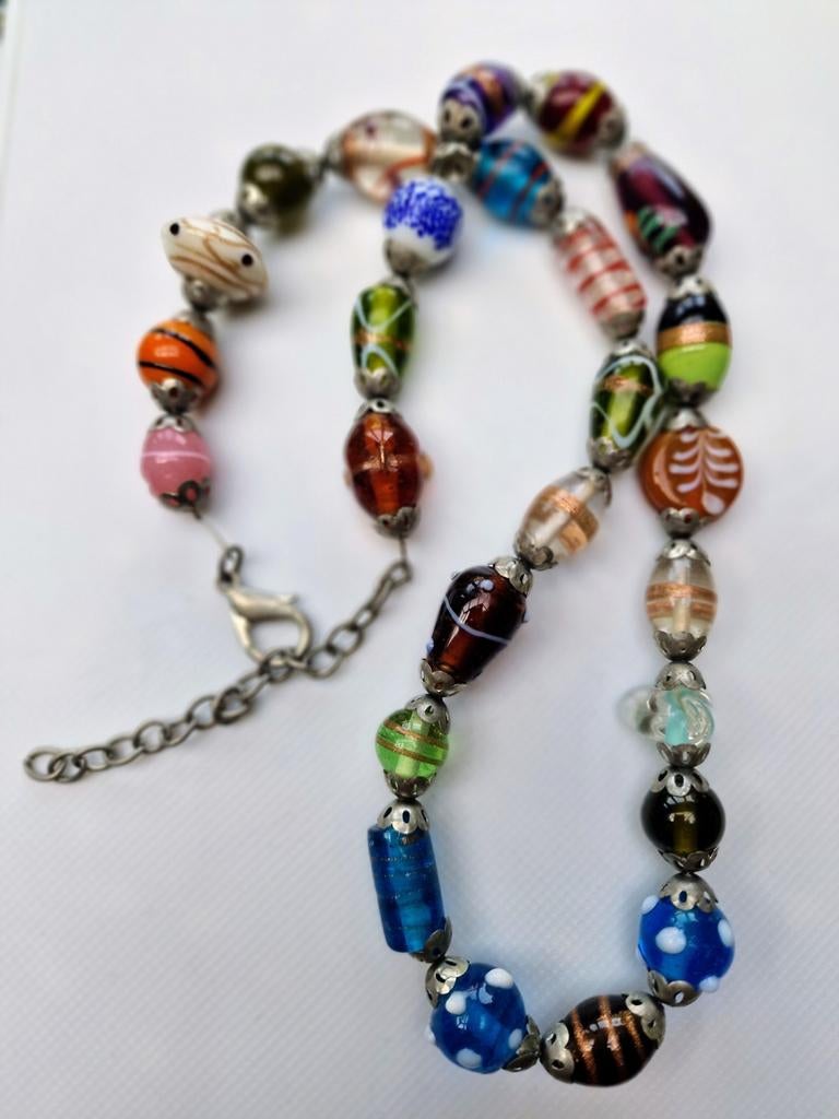 Deze ketting heeft verschillende handgemaakte glaskralen in diverse kleuren en patronen. De kralen zijn ovaal en rond van vorm. De ketting heeft een zilverkleurige sluiting.