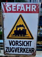 Te koop nieuw in verpakking. Metalen bord met de tekst, 'gefahr vorsicht zugverkehr, het bord heeft een vintage uitstraling me