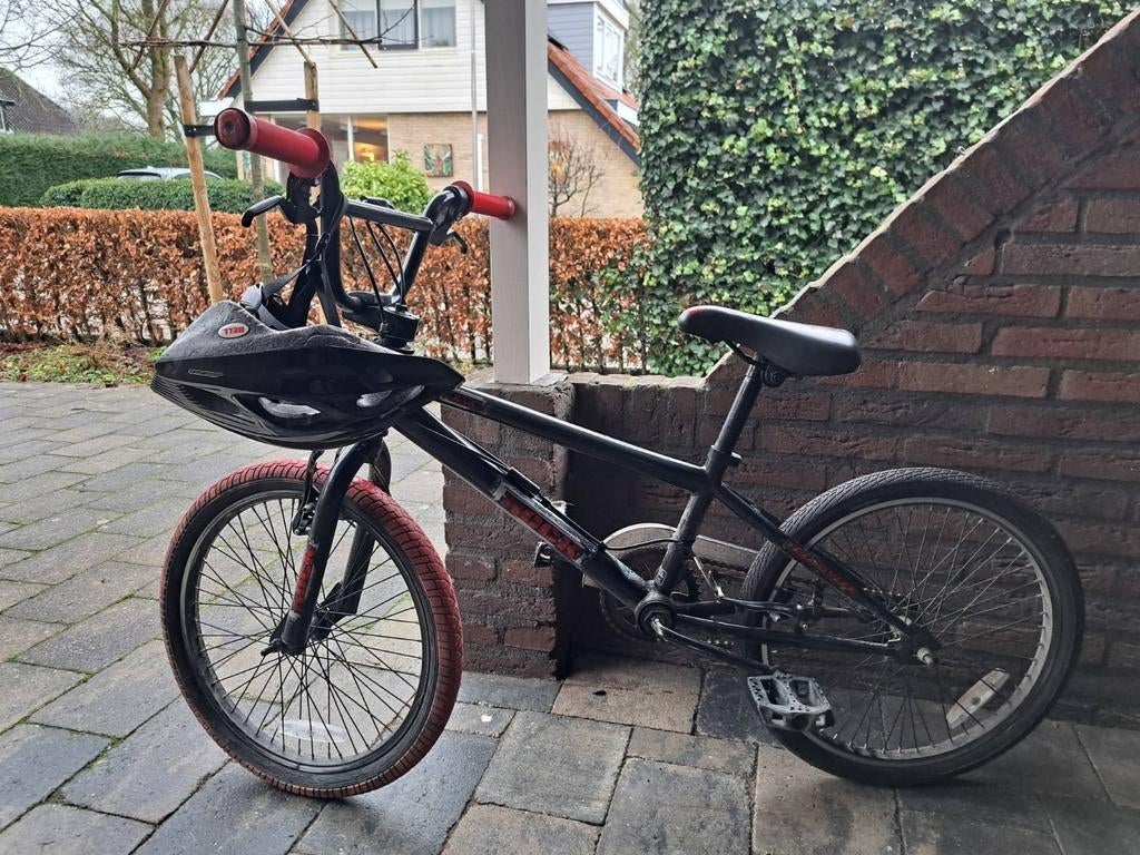 Een zwarte crossfiets met rode accenten, zoals de handvatten en de banden. Er zit een helm bij. De fiets is geschikt voor kinderen van 9-11 jaar.