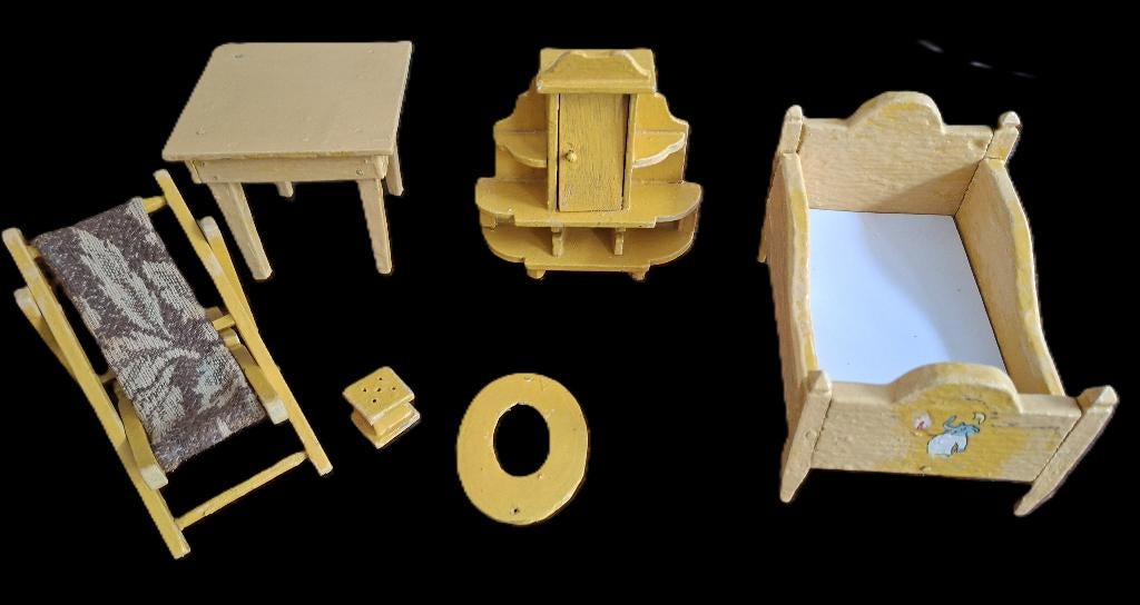 Antieke handgemeekte poppenhuismeubeltjes volkskunst