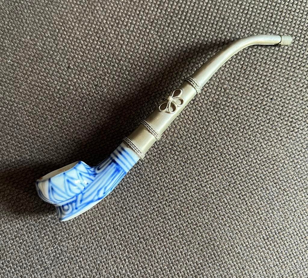 Dit pijpje heeft een porseleinen kop en een licht metalen steel. Hij is helemaal gaaf.