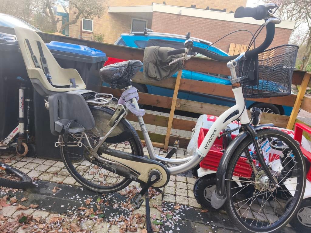 Moederfiets met achter zitje. Bok standaard, 7 versnellingen, mandje voorop. Niet moeders mooiste (meer zie foto's) verder opzich prima fiets . Ben ooit de sleutel kwijt geraakt dus slot zelf hebb