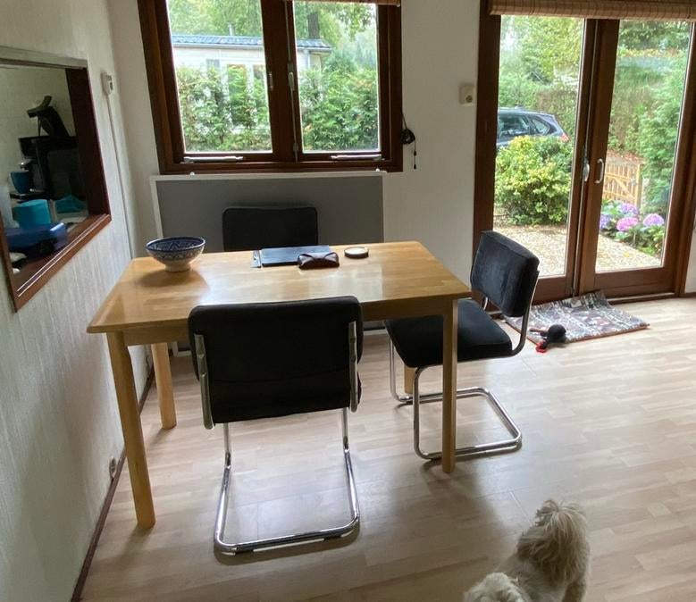 Een mooie stevige tafel van hardhout, lichte kleur, rechthoekig 1.20X74,5cm, hoogte 74cm. De tafel is gebruikt, maar ziet er nog goed uit. De poten zijn demontabel. Leuke maat, is ook als bureautje teGebruikt Ophalen of Verzenden Vier personen