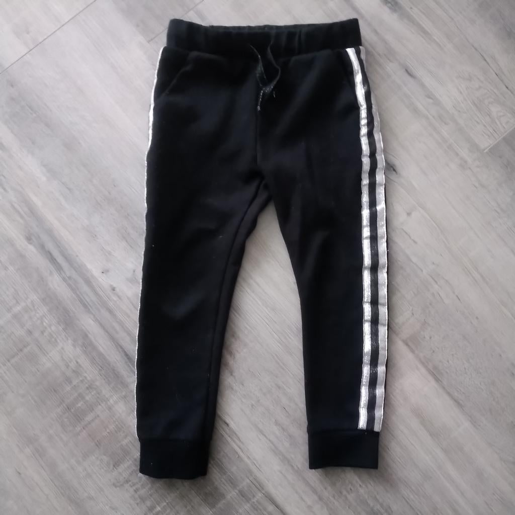 Zwarte joggingbroek/sweatpants, maat 98 er zit een zilveren strook aan de zijkanten van de broek. Nog netjes. Komt uit rook en huisdiervrij huis.