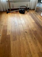Massief eiken vloerdelen, ongeveer 20 m2. De vloer is al gedemonteerd en ligt klaar om opgehaald te worden. De planken hebben een mooie natuurlijke uitstraling.