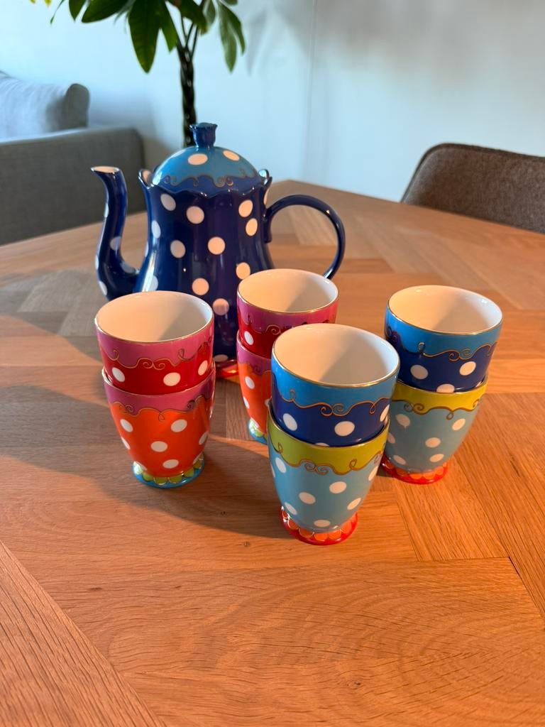 Mooie set van oilily (douwe egberts) met theepot en 8 mokken. Gebruikt maar nog in zeer goede staat.