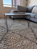 Stijlvolle salontafel met marmer look blad en metalen frame. De tafel is in goede staat en heeft een rechthoekige vorm. Afmetingen 60cm x 60cm x 40cm.
