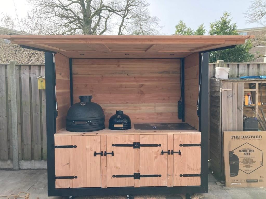 Buitenkeuken met luifel afmeting b180cm d100cm h220cm buitenkeuken is voorzien van: - regenwaterafvoer - snijtegel - verrijdbare wielen - stroompunt - met of zonder uitsparing voor de barbecue. - Inde