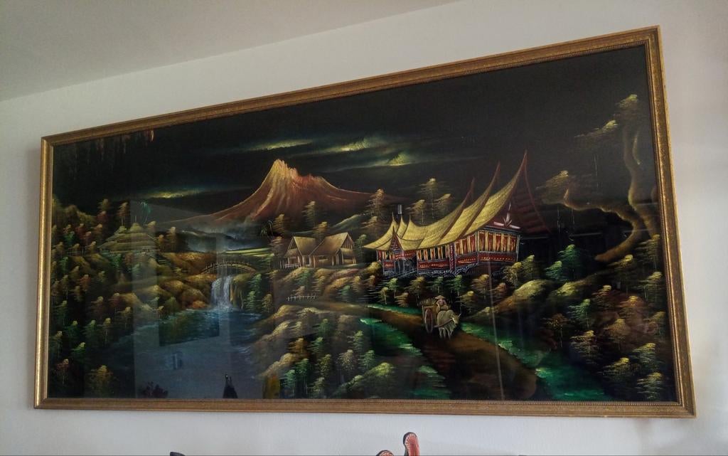 Dit is een oosters schilderij op fluweel doek, voorzien van een glasplaat. Het toont een landschap met bergen, huizen en watervallen. Het schilderij zit in een gouden lijst met glasplaat dit schilderi