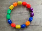 Kleurige blokken van fisher price om een grote kralenketting te maken en zo ook de kleuren te leren.