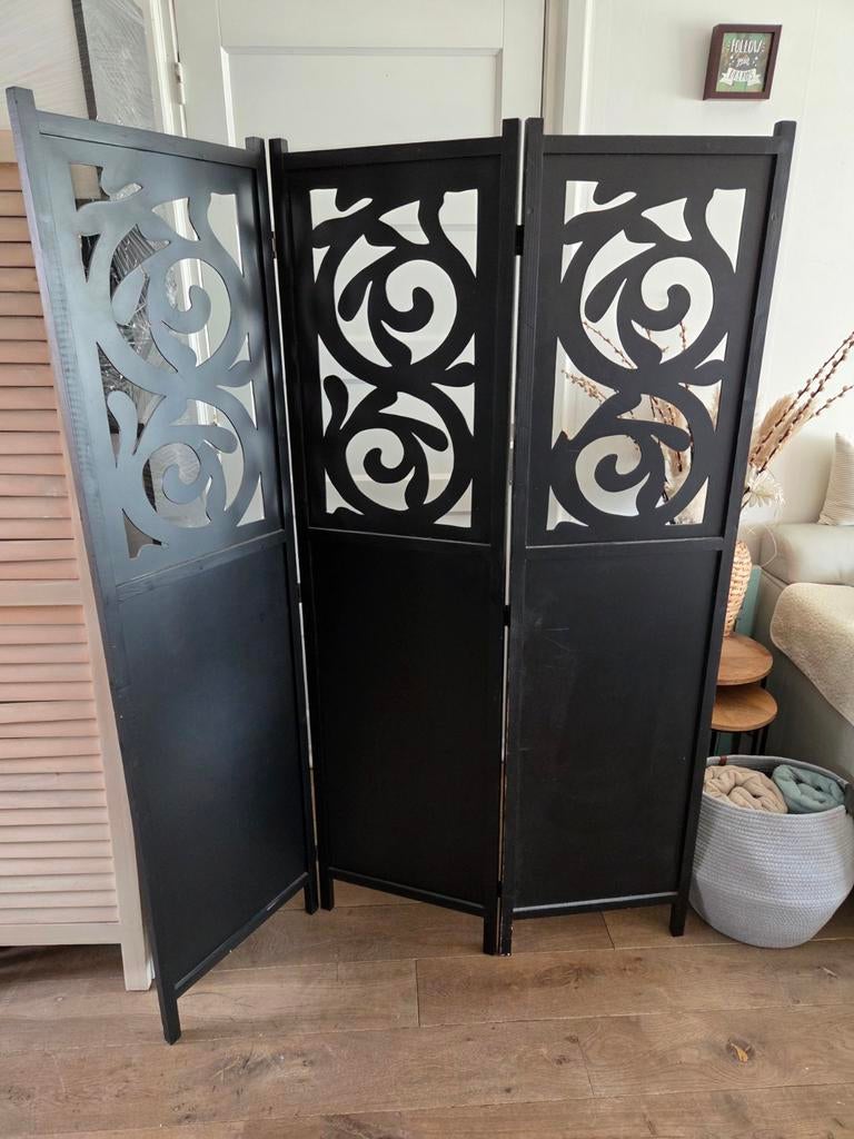 Zwart houten kamerscherm . Hier en daar een beschadiging en er ontbreekt een stukje , zie foto's afm 170 hoog135 breed kijk ook eens naar mijn andere advertenties
