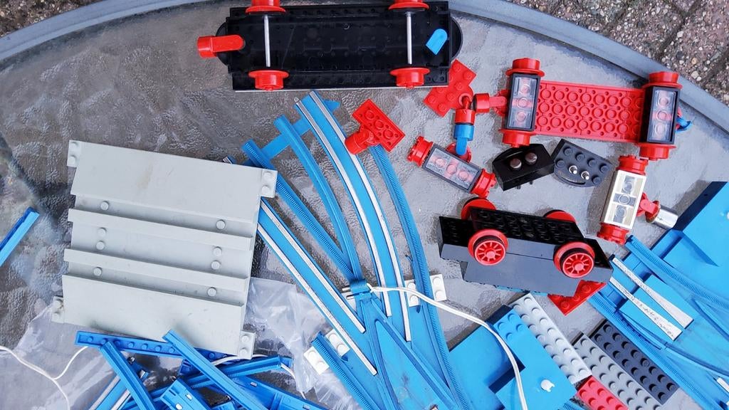 Oude retro Lego blauwe rails locomotief moter wissels wagon.