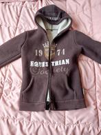 Dit is een heerlijk warm bruin gevoerd fleecevest van harry's horse met capuchon in maat 140. Het vest heeft een dubbele ritssluiting en twee zakken aan de voorkant. Op de borst staat een opdruk m