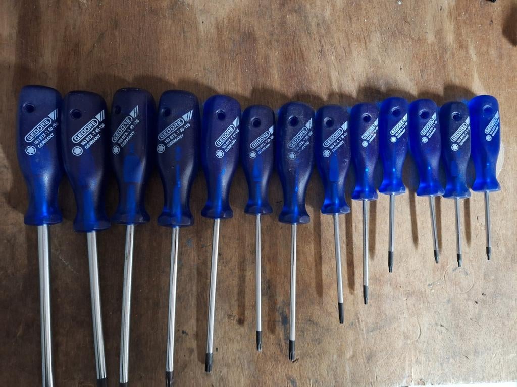 Gedore torx schroevendraaiers 13 stuks maat 50,45 40,30,27,25,20,15,10,9 en 3x 7. Cobalt blauwe handgrepen, deze zijn niet meer te verkrijgen. Bieden naar waarde en op onzin biedingen wordt niet gereaNieuw Ophalen of Verzenden