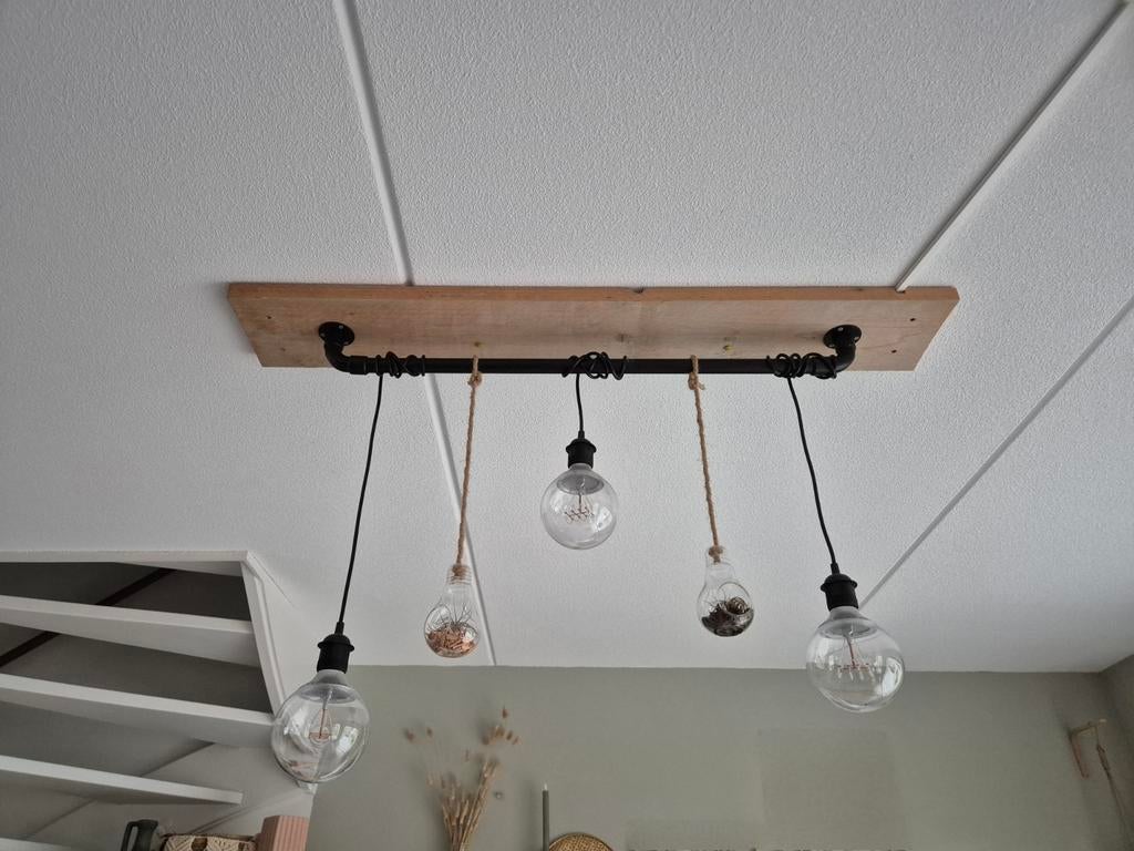 Industriele hanglamp - inclusief 2 vaasjes waarin een luchtplantje zit. Zwarte gedeelte waaraan de lampen zit is 93 cm. Kabels zou je nog kunnen afwikkelen waardoor je de lengte zelf kunt afstemmen. I
