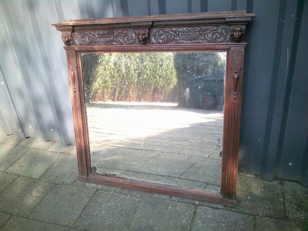 Oude spiegel, houten uitgewerkte lijst, ongeveer 1-1mtr, spiegel is verweerd. 22,50Euro.