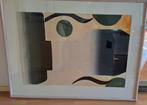 Een abstract schilderij met een wit/roze frame. Het kunstwerk toont geometrische vormen en organische lijnen in verschillende kleuren. Het is een uniek stuk dat een moderne touch aan elke ruimte geeft