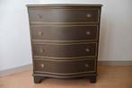 Vintage serpentine dresser met vier lades, professioneel gerestyled. De kast is geschilderd in een warme grijstint met handmatig a