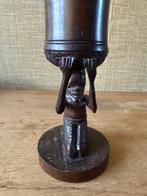Een handgesneden, houten beeldje, waarschijnlijk van afrikaanse oorsprong, dat een figuur voorstelt die een beker of kom boven zijn hoofd draagt. Het is een stuk tribale kunst, vaak gebruikt als decor