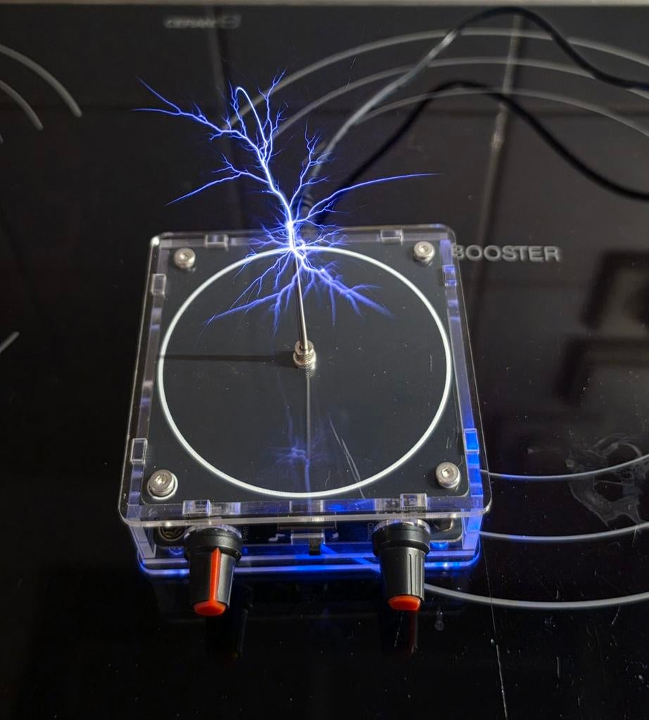Dit apparaat is een miniatuur tesla-spoel, een type resonantietransformator die wordt gebruikt om hoogspanning te produceren. Functie: genereert hoge spanningen bij lage stroomsterkte en hoge frequent