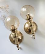 Stijlvolle set van twee vintage wandlampen in hollywood regency stijl. Uitgevoerd in messing met glazen bollen met subtiele bubbel