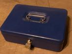 Blauw metalen geldkistje met sleutel. In goede staat, maar met lichte gebruikerssporen. Ideaal voor het veilig opbergen van contant geld en andere waardevolle spullen.