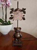 Art nouveau stijl lamp met gegoten beer, metaal met prachtige glazen lampen kapje in oudroze kleur en bloem vorm. De lamp is bruin