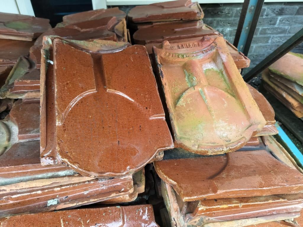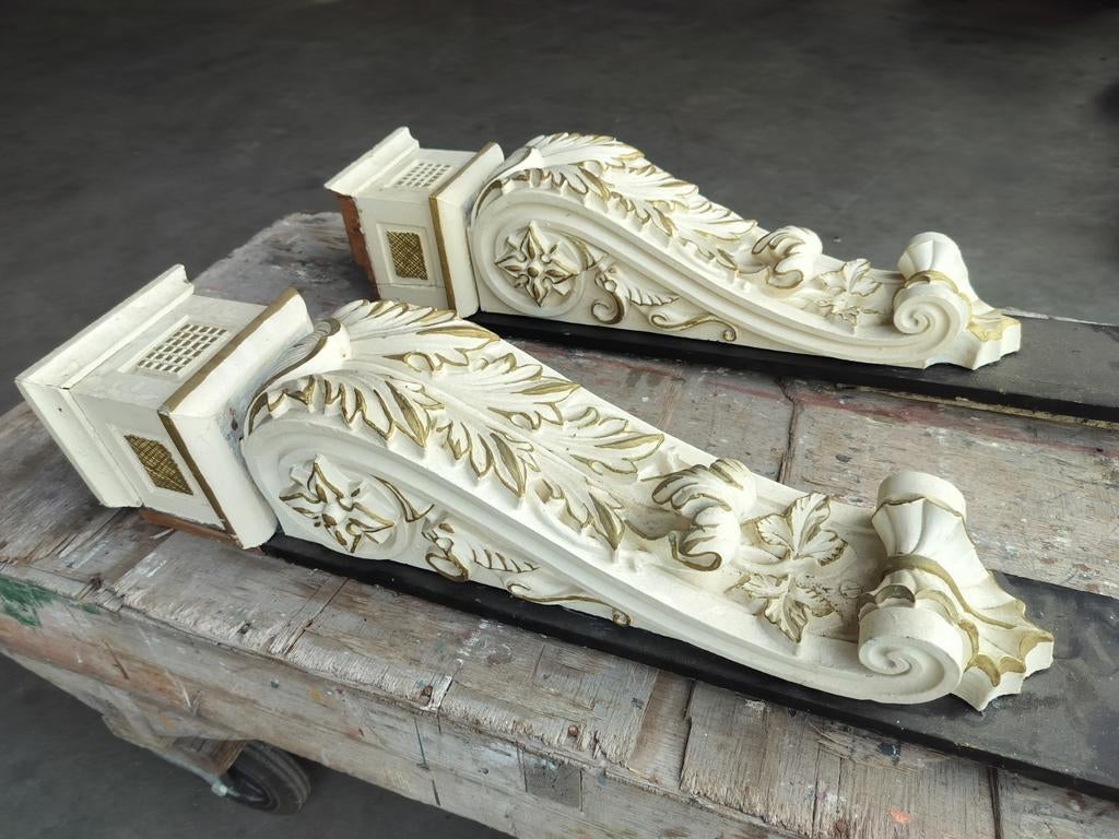 2 zeer luxe sierklossen schouw gegoten terracotta , hout . Zitten nog op een oude plank , hoogte zonder de oude plank 75 cm ! Unieke oude , heel en mooi . 18E eeuws ? Mooi voor herenhuis , grachtenpan