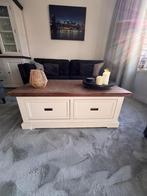 Mooie salontafel met lades en een eikenhouten blad. Onderkant is crèmekleurig en bovenblad donker. Maten : hoogte: 47 cm breedte: 120cm diepte: 70 cm