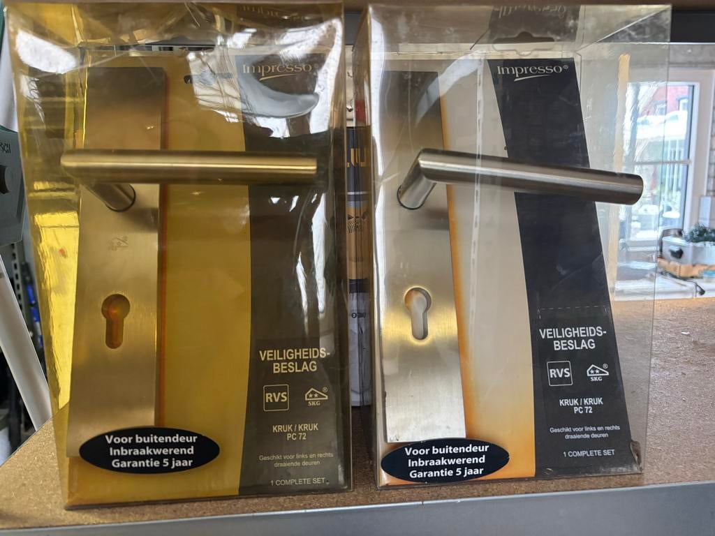 Twee sets nieuw deurbeslag van roestvrijstaal (rvs). Veiligheidsbeslag geschikt voor buitendeuren. Inbraakwerend. Geschikt voor links- en rechtsdraaiende deuren. Compleet met kruk/kruk pc72. €40