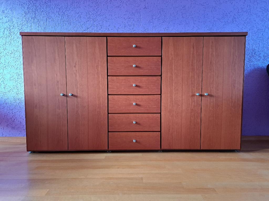 Oerdegelijk dressoir van kersenfineer. Merk en type is mega design 6018. In originele, nette maar gebruikte staat, passend bij de leeftijd. Lxdxh : 204,2 x 43,6 x ± 112,5 cm (hoogte afhankelijk hoe de