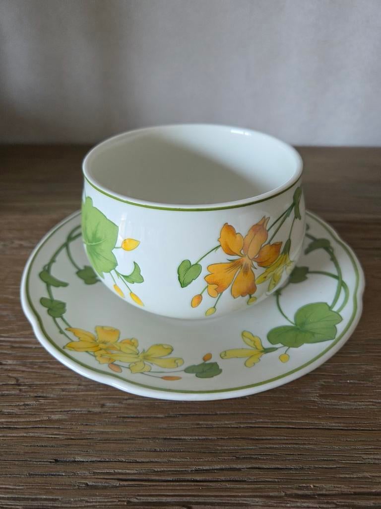 Prachtige sauskom met schotel ( is een deel) van villeroy & boch, voorzien van een charmant botanisch design met gele en oranje bloemen en groene bladeren. Ideaal voor het serveren van sauzen of a