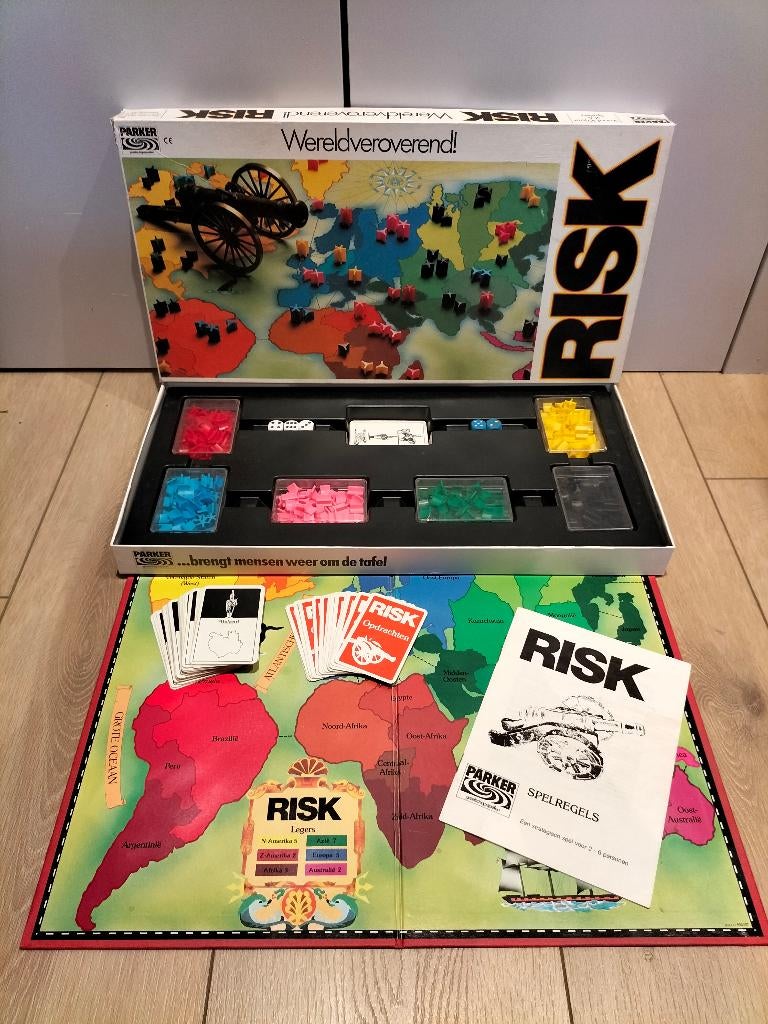 Risk, in de versie van parker in de witte doos. Compleet met alle opdrachtkaarten, gebiedskaarten en jokers. Heeft drie witte aanvalsdobbelstenen en twee blauwe voor de verdediging.