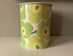 Mooie stevige en glanzende metalen prullenmand van marimekko met grote groene unniko bloemen. Maija sofia isola (1927-2001) was ee