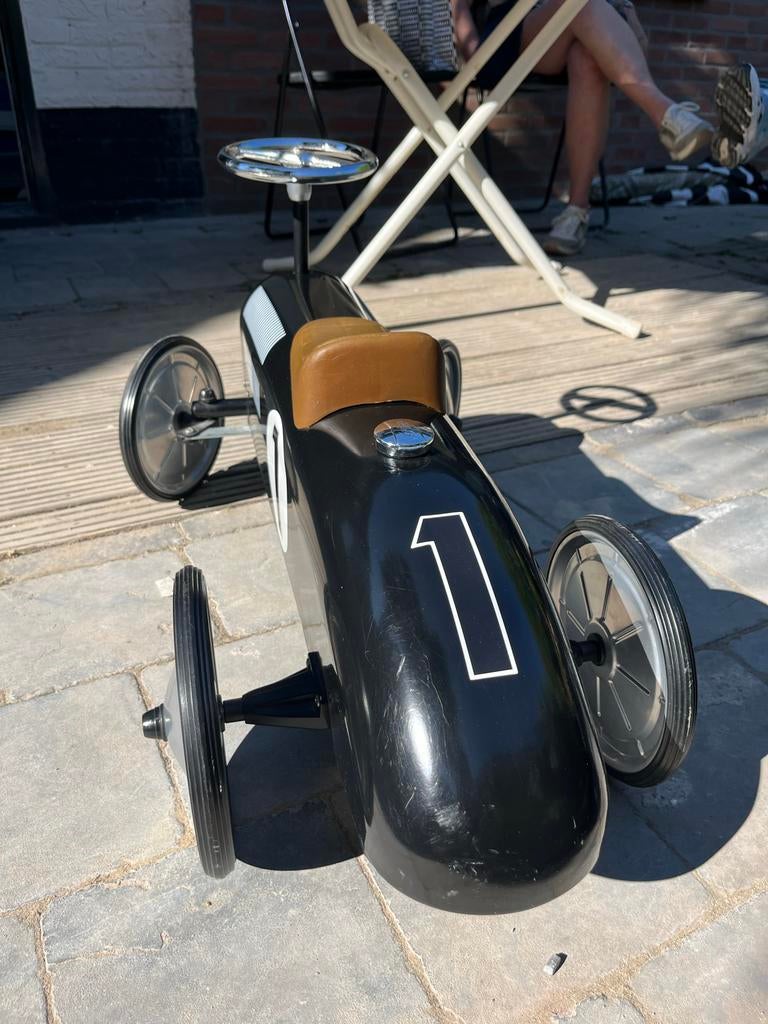Leuke loopauto in retrostijl, ideaal voor de kleine coureur. De auto is zwart met witte accenten en het nummer 1, wat zorgt voor een klassieke race-uitstraling. Perfect voor uren speelplezier binnen oGebruikt Ophalen of Verzenden